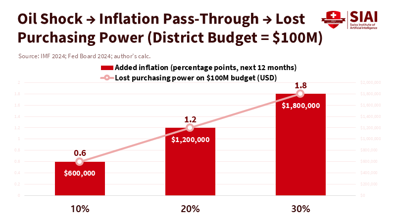 석유 가격 상승은 곧바로 재정 지출 구조에 반영된다. 공공부문은 매년 막대한 전기·가스비를 지출하며, 이는 인건비 다음으로 큰 항목으로 꼽힌다. 상업용 건물 전력 소비에서도 공공시설 비중은 상당하다. 2024년 고등교육 물가지수는 3.4% 올랐는데, 전기·가스 요금 상승이 주요 원인으로 지목됐다. 일부 지방정부는 전력 요금이 15% 이상 오를 것으로 예상하고 예산을 늘려 잡았다. 동시에 인플레이션 압력도 뒤따른다. 국제통화기금(IMF)은 석유 의존도가 높은 국가에서 유가가 10% 오르면 1년 안에 인플레이션이 0.7%포인트 상승한다고 분석했고, 미국 연준은 같은 조건에서 미국 물가가 0.15%포인트 오른다고 추정했다. 국가별 수치는 다르지만, 유가가 물가를 끌어올린다는 점은 공통적이다.